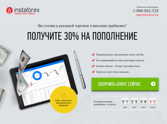 ИнстаФорекс клиенттеріне тек қосымша 30% бонусты табу мүмкіндігі. Есепті толық қолдану үшін жазу жөнінде сіздің толық алу сомасына +30% қосу. Бонус моменталды есепке ала алады, шектеулерсіз кездейсоқ айыпталмайды.